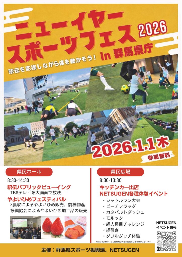 2026年元旦、ニューイヤー駅伝のスタートからゴールまでを見守る群馬県庁 その群馬県庁前の県民広場にて超人競技などをお楽しみいただけます